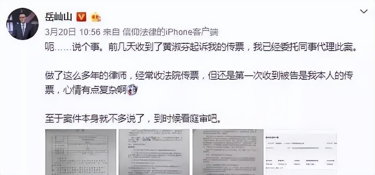 岳屾山对这一无理的指控非常无语,他在微博中写道:“做了这么多年律师,经常收到法院传票,但是还是第一次收到被告是我本人的传票。心情有点复杂。”