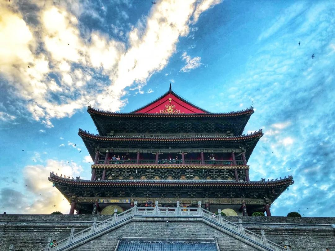 西安钟楼、鼓楼:位于西安市市中心,始建于明洪武年间,有着600多年历史,是中国现存的同类建筑中体量最大、保存最完整的钟鼓楼。钟鼓楼为钟楼和鼓楼的合称,均为中国古代的报时建筑。钟楼的登楼入口在地下环形通道中,鼓楼的登楼入口就在地面。天气好的话,登上钟楼可以从四个方向分别望到四座城门。