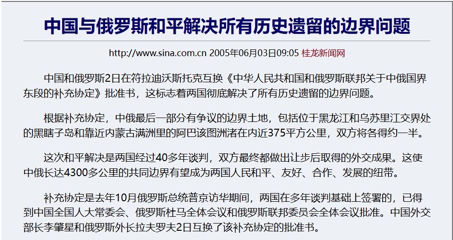 《中国与俄罗斯和平解决所有历史遗留的边界问题》 桂龙新闻网 2005年6月3日
