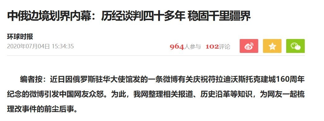 《中俄边境划界内幕,历经谈判40多年,稳固千里疆界》 环球时报 2020年7月4日
