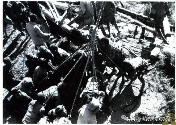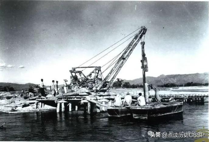 云南芒市,修筑中印公路的工人正利用机械设备打桩架桥