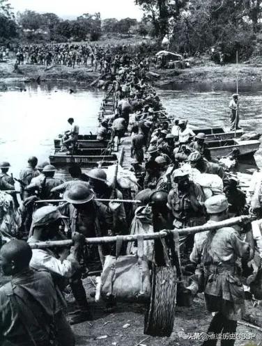 中美军队通过浮桥渡过孟拱(Mogaung)河