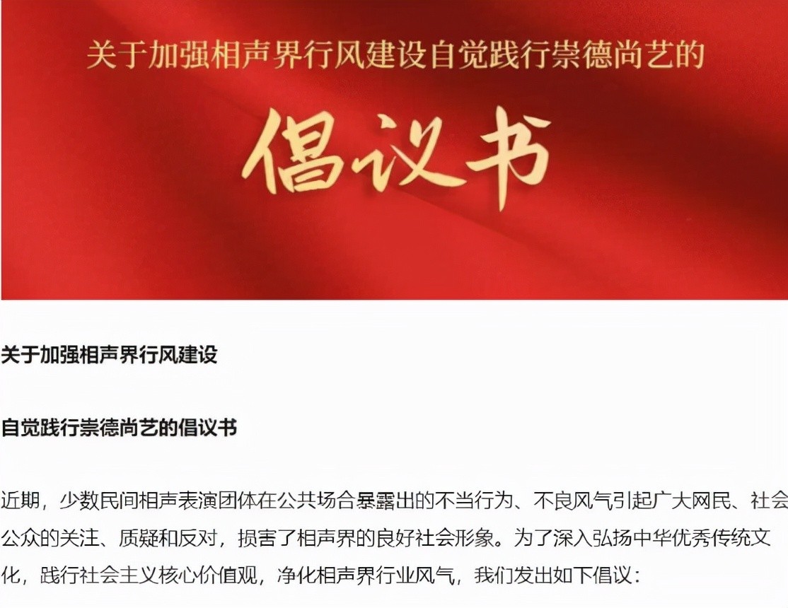 之后的十几年里,以中国曲艺家协会为代表的曲艺界又多次开展“反三俗”活动,最近一次则是2021年初的“关于加强相声界行风建设自觉践行崇德尚艺的倡议书”。