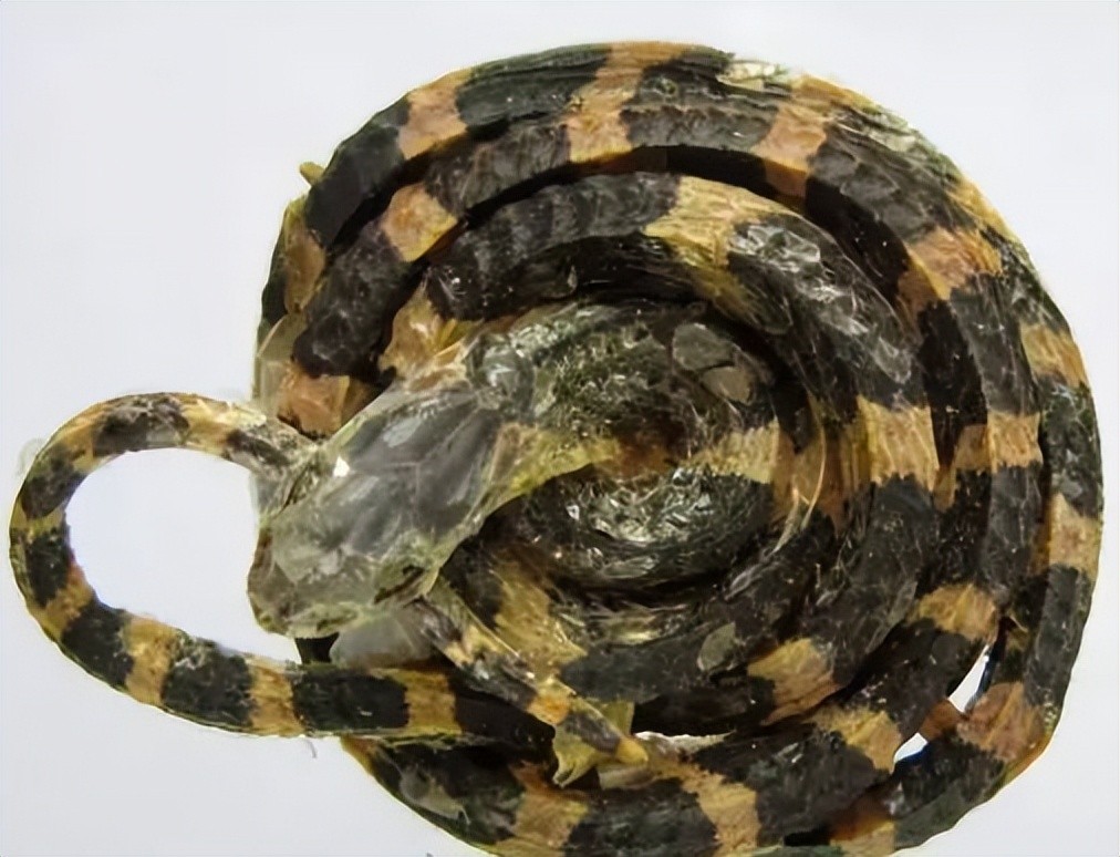 正品呈圆盘状,盘径3~6 cm,蛇体直径0.2~0.4 cm;头在中央,尾细常纳于口内。背部黑色或灰黑色,有光泽,有白色环纹28—58个,黑白相间,白纹在背部宽1~2鳞片,向腹部逐渐放射增宽。黑纹3—5鳞片,背正中显著突出1条脊棱,脊棱扩大呈六角形,背鳞通身15行;肛鳞完整;尾下鳞单行37~55;腹面黄白色,鳞片稍大。气微腥,味微成。