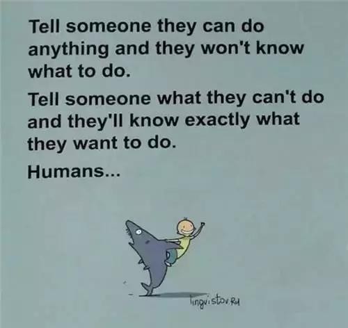 ▲对他们说,他们可以做任何事,他们会不知道自己该做什么。告诉他们,他们不能做什么事,他们马上就知道自己想要做什么了。唉,人啊……