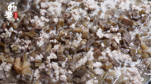 3、芋梗干放入开水中泡开;取一斤五花肉,先将肥肉剁成肉丁,下锅炼油,再将瘦肉剁成肉丁,放入锅中翻炒爆香,加入适量食盐调味。