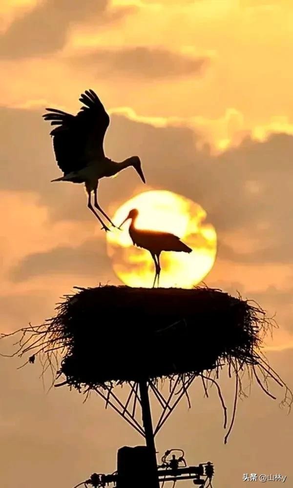 夕阳刚好落到小鸟儿的巢穴之上,多么温馨的一幅画面!