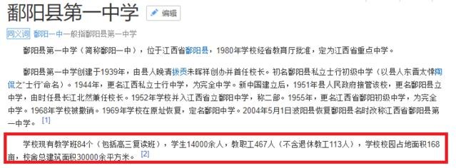学生是14000人,还是3270人?168亩和128亩,这个差入太大。不过可肯定的是,鄱阳一中要生源有生源,要办学场地有办学场地。这么多的生源、这么好的办学条件,即便拿到全县文、理科状元,也不尽人意!