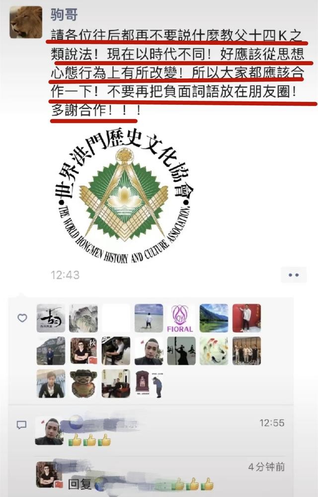 他高调宣称,请各位以后不要再说什么教父、14K之类的说法,现在已时代不同,好应该从思想心态行为上有所改变,所以大家都应该合作一下,不要把负面词语放在朋友圈,多谢合作。