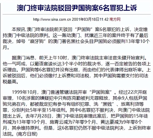 2000年7月28日,回归后的澳门中级法院再次审理此案,将他的刑期减至13年10个月。不服判决的崩牙驹继续要求上诉。2001年3月16日,澳门终审法院驳回上诉,维持原判,至此,一代枭雄的尹国驹终于开始了漫漫牢狱路。