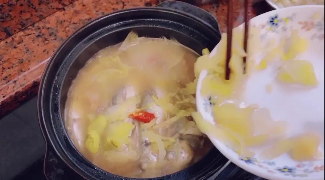 5:大火煮开转中火焖煮10分钟再加入咸菜丝焖2分钟即可。