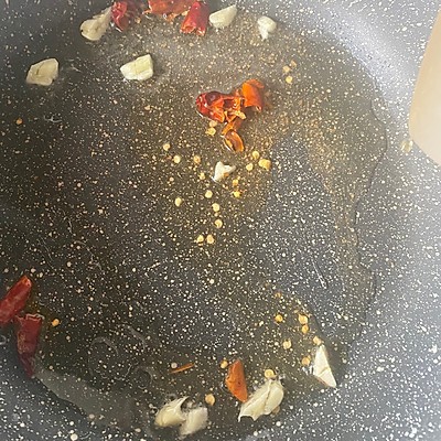2、热锅凉油,放入蒜末干辣椒、花椒粉炒香;