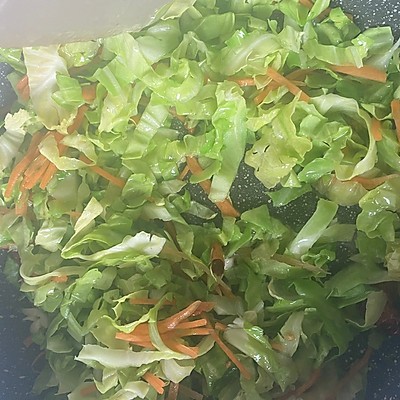 3、放入圆白菜丝、胡萝卜丝翻炒几下后,放入绿豆芽、生抽、老抽、蚝油、鸡精、盐翻炒至断生;