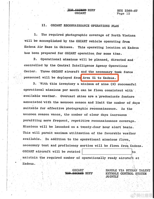 1967年,51区也出现在了中央情报局的备忘录里(BYE 2369-67),这个备忘录的内容是讨论3架A-12从这里直接飞到冲绳美军基地的可能性,途中加油三次,然后再从冲绳起飞区侦察越南。