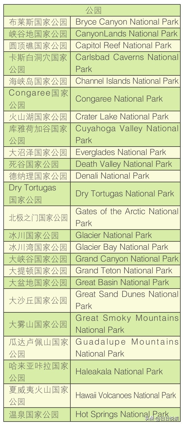 自1872年黄石国家公园成为美国及世界上第一个国家公园之后,不断有新增的区域被美国政府开辟为国家公园。美国的国家公园主要分布在西部地区,每一处都有自己的特色。政府明文规定禁止任何人砍伐树木和其他破坏公园的活动,因此所有的国家公园呈现给游人的都是最原始的自然形态。美国的国家公园至今已有57个,具体名单如下: