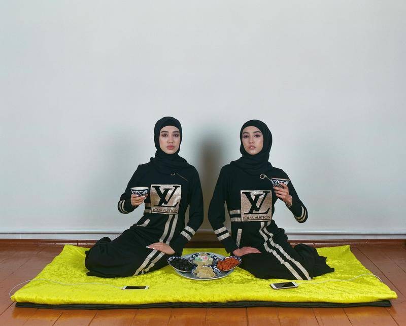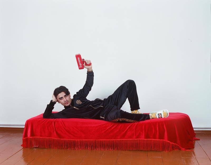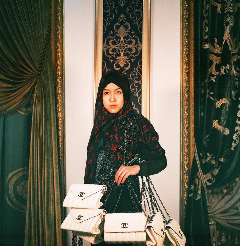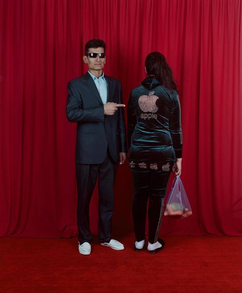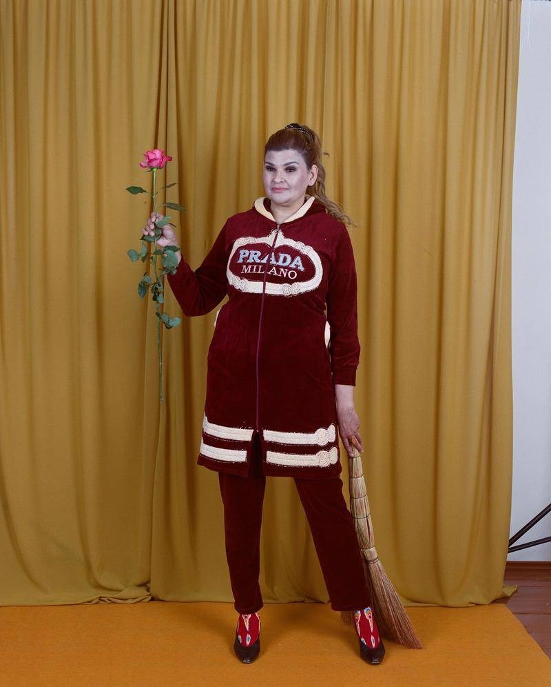 画面中,色彩厚重、质感拙朴的乌兹别克斯坦传统服饰,附上夸张闪耀、象征财富的西方奢侈品LOGO,在库尔班巴耶夫精致的布景和构图中,两种不同文化之间呈现的割裂感被消解,在画面中恰到好处地相互融合。一种破坏秩序的美感涌动的同时,隐约带有对乌兹别克斯坦消费主义文化揶揄的意味,在暗红色幕布的映衬下,看起来像是某场荒诞派戏剧剧照。