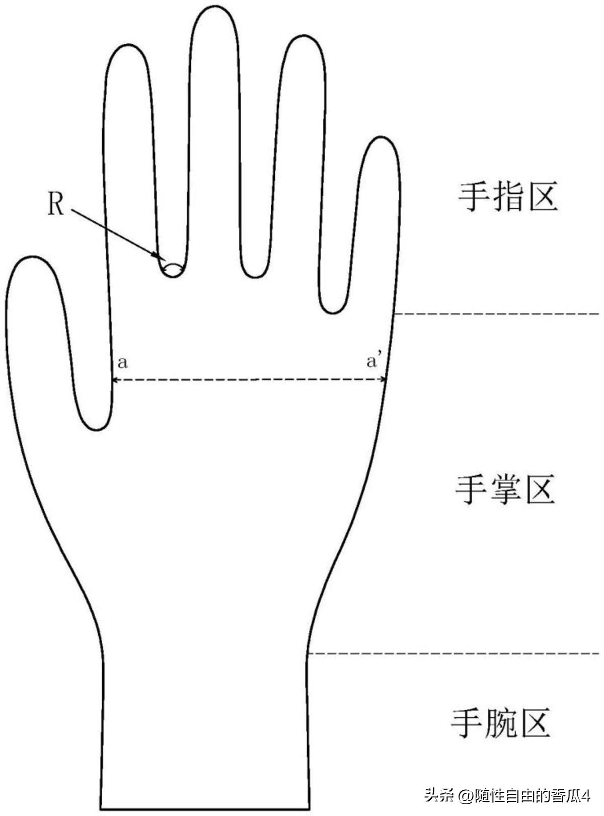 参照图3所述,手掌部由上至下依次包括手指区、手掌区和手腕区,手掌区具有五个手指,每个手指之间为指缝,手指与手掌之间的连接处为指缝根部,指缝根部为圆弧R,其中,现有的指缝根部圆弧直径值为5mm至6mm。