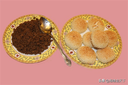 曾经是清宫中的御膳,又名“圆梦烧饼”,它象征着梦想成真,并有祝愿吃到它的人健康长寿、升官发财的寓意,被誉为北京小吃中的精品,享誉京都数十年。它的做法相当独特,与一般市面上见到的烧饼做法不一样,它将发面和好对碱,加一点白糖揉匀,揪成小坯子,然后将坯子用手掌在案板上压成圆片,再另用2克左右的面揉一个小面球沾上一点香油,放在圆片中央,把小面球包进去后,用手按成5厘米厚的扁圆形饼,饼上刷上点糖水,粘上芝麻仁的一面朝上,放在饼铛里用炭火烤熟。放小球的目的是为了在吃的时候能完整地掰开,以利于加炒肉末。