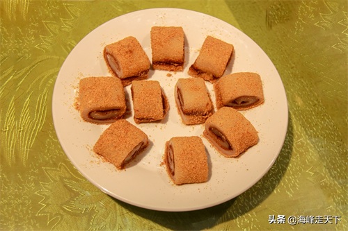 芸豆卷是北京民间小吃,同豌豆黄一起流传入清宫。其卷形似马蹄,分为甜、咸两种:甜的沙凉细糯,咸的绵软可口,实为不可多得的美味。相传一天慈禧在北海静心斋的院子里纳凉,忽听墙外传来一阵敲打铜锣的叫卖声。慈禧便问她身边的侍女,外面是干什么的。侍女告诉她是卖芸豆卷的。慈禧便立即叫身边的宫女给她买一些尝尝。当时天气很焖热,慈禧品尝后,感觉清爽适口、香甜细嫩,入口即化。于是就把这个人留在宫中,专门为她做小吃。