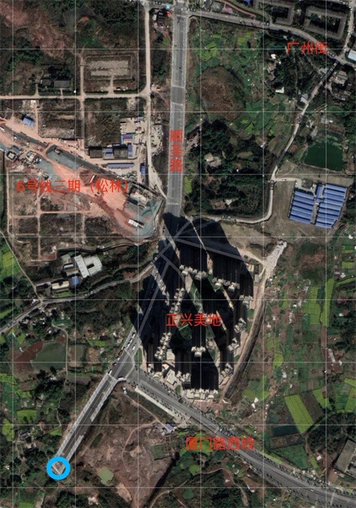 沿着顺圣路一路向南,经过了广州街,到了下午顺圣路两侧就有很多摆摊设点的买家,一片热闹的景象。在正兴美地小区的左上角,地铁6号线三期松林站的电梯口已经修出地面,不过周围还是荒土。
