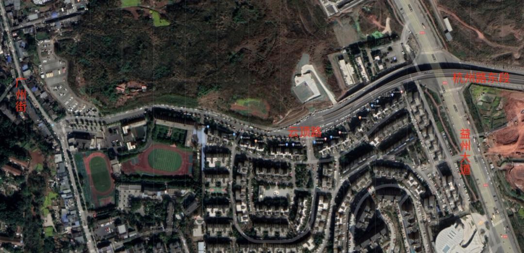 杭州路西段直接连接云顶路,云顶路西侧直接连通广州街,最后抵达锦江。