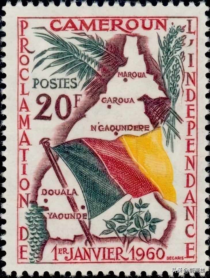 上图为喀麦隆1963年发行的纪念统一2周年邮票,为喀麦隆版图及国旗。