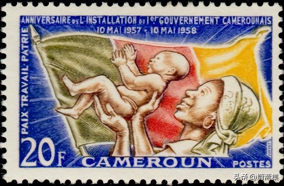 1957年10月,法属喀麦隆成立自治政府,成为法兰西共同体内的自治共和国。1958年,喀麦隆发行了纪念自治自认成立1周年邮票,图案为喀麦隆国旗前被母亲高高举起的婴儿,象征着国家的新生,老母亲眼里是满满的希望。