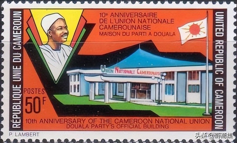 上图为1971年,法国时任总统蓬皮杜(Georges Jean Pompidou, 1911-1974)访问喀麦隆时,喀麦隆发行的纪念邮票,当时的喀麦隆总统为阿希乔,邮票中间的建筑为总统府。