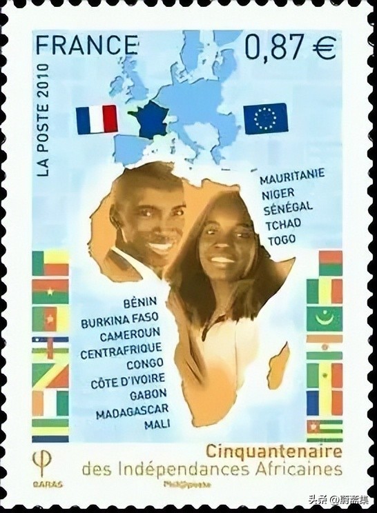 上图为法国2010年发行的非洲独立年50周年纪念邮票,图案为非洲大陆上的年轻男女头像及14个新生国家的国旗,贝宁、布基纳法索、喀麦隆、中非共和国、刚果共和国(刚果布)、科特迪瓦、加蓬、马达加斯加、马里、毛里塔尼亚、尼日尔、塞内加尔、乍得和多哥。