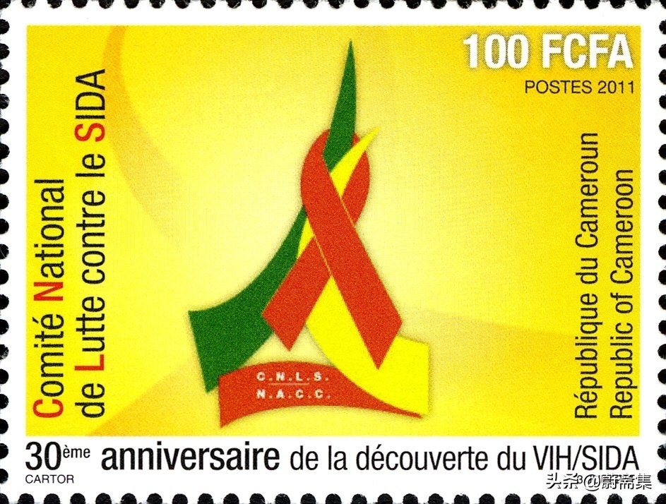 2011年,喀麦隆发行了发现艾滋病30周年纪念邮票,红丝带挂在喀麦隆国旗组成的稳定三角之上,表达了国家对防治艾滋病的坚定立场以及对艾滋病人的支持与关爱。