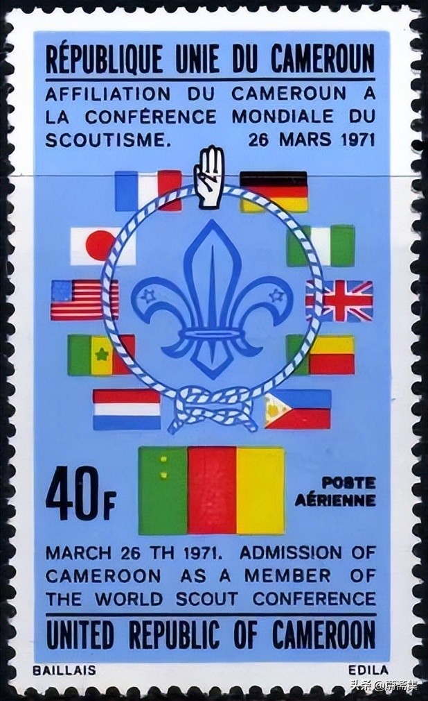 喀麦隆于1971年加入世界童子军大会,1973年,喀麦隆发行了加入世界童子军大会2周年纪念邮票,邮票上是童子军标志、喀麦隆国旗及世界上其他一些主要国家的国旗。
