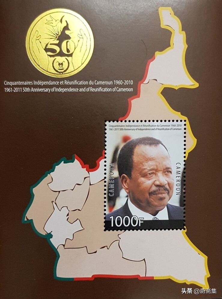 2010年,喀麦隆发行了纪念独立与统一50周年小型张,邮票主图为总统比亚的肖像,小型张边纸部分为喀麦隆行政区域图及50周年纪念标志。喀麦隆地图的轮廓为国旗色的绿、红、黄三色组成。