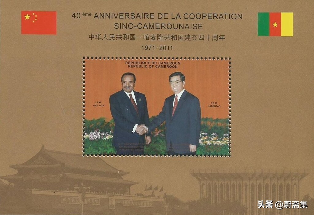 2011年,喀麦隆发行了纪念与中国建交40周年纪念邮票,小全张边纸上图案为中国北京的祈年殿和喀麦隆雅温得的独立纪念碑,三枚邮票分别是雅温得的妇产医院、多功能体育场及工程施工现场。