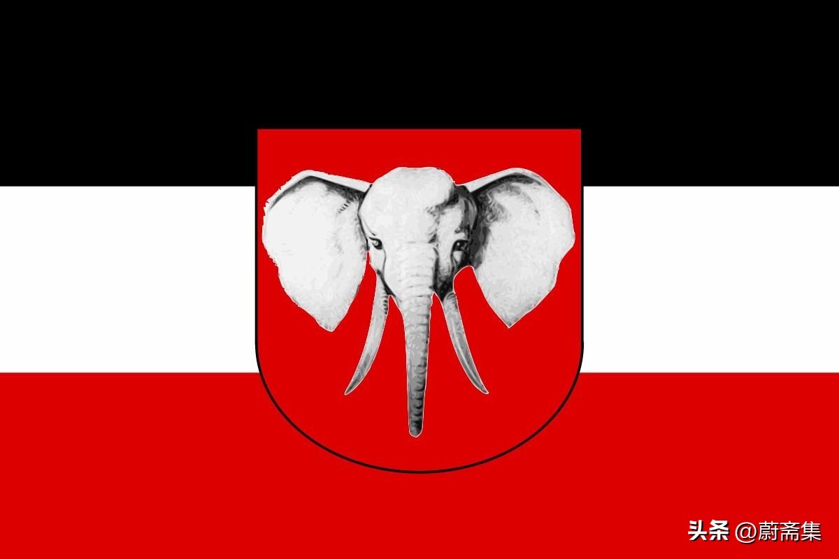 1884年7月14日,德国总领事Gustav Nachtigal博士作为德皇特使同国王—杜阿拉(Duala)以及喀麦隆其他地方的藩王一起签署了保护条约,由此宣布喀麦隆成为德国所谓的“保护地”,实质上就是德国海外殖民地。上图为德国喀麦隆的殖民地旗帜,为德国国旗上加了象征喀麦隆的大象头部。