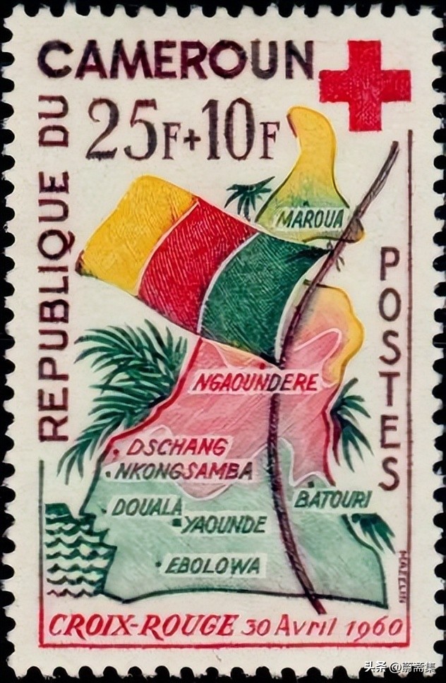 上图为1961年,喀麦隆发行的喀麦隆红十字会成立1周年纪念邮票,图案为喀麦隆国旗及喀麦隆版图。