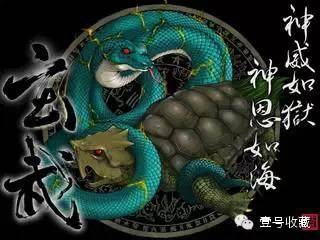 是一种由龟和蛇组合成的一种灵物。玄武的本意就是玄冥,武、冥古音是相通的。武,是黑色的意思;冥,就是阴的意思。玄冥起初是对龟卜的形容:龟背是黑色的,龟卜就是请龟到冥间去诣问袓先,将答案带回来,以卜兆的形式显给世人。因此,最早的玄武就是乌龟。以后,玄冥的含义不断地扩大。龟生活在江河湖海(包括海龟),因而玄冥成了水神;乌龟长寿,玄冥成了长生不老的象征;最初的冥间在北方,殷商的甲骨占卜即「其卜必北向」,所以玄冥又成了北方神。