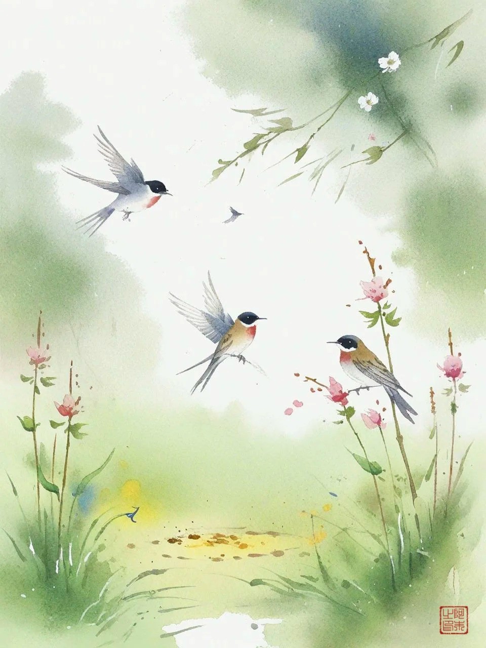 天涯芳草翠绿一片,路旁柳絮飘飘,似乎在争春斗艳。一声啼鸟宣告春天的结束,落花满地,人们纷纷踏上归途。世事真无奈,既充满了春日的生机又带着离别的忧伤。
