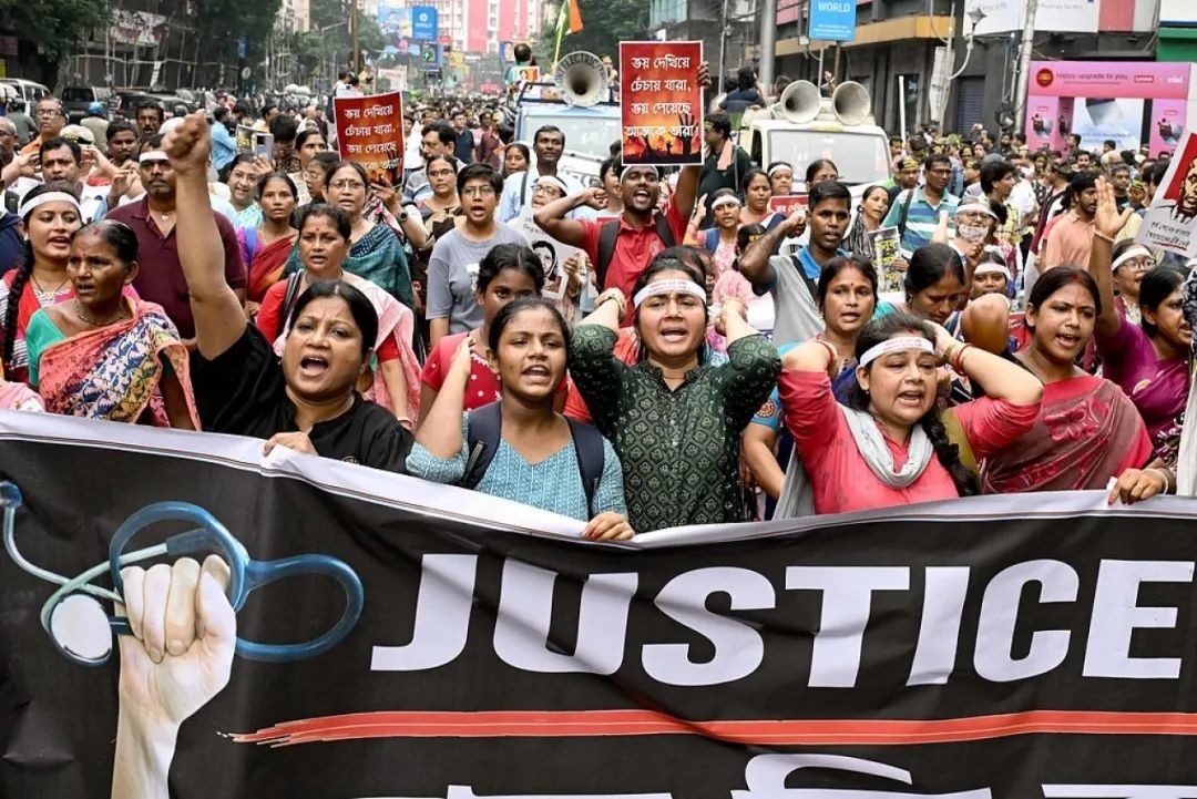 当地时间2024年10月2日,印度加尔各答,医疗人员和活动人士举着横幅、高呼口号进行游行示威,要求对实习女医生强奸谋杀案进行公正调查。 (视觉中国/图)