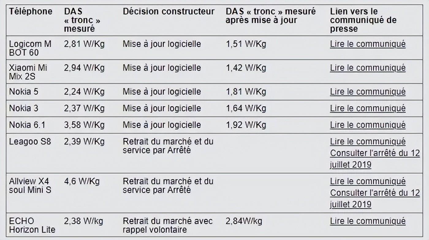 在2020年的一篇通告当中,ANFR直指包括小米MIX 2S、红米Note 5在内的8款手机,集体SAR数值超标。