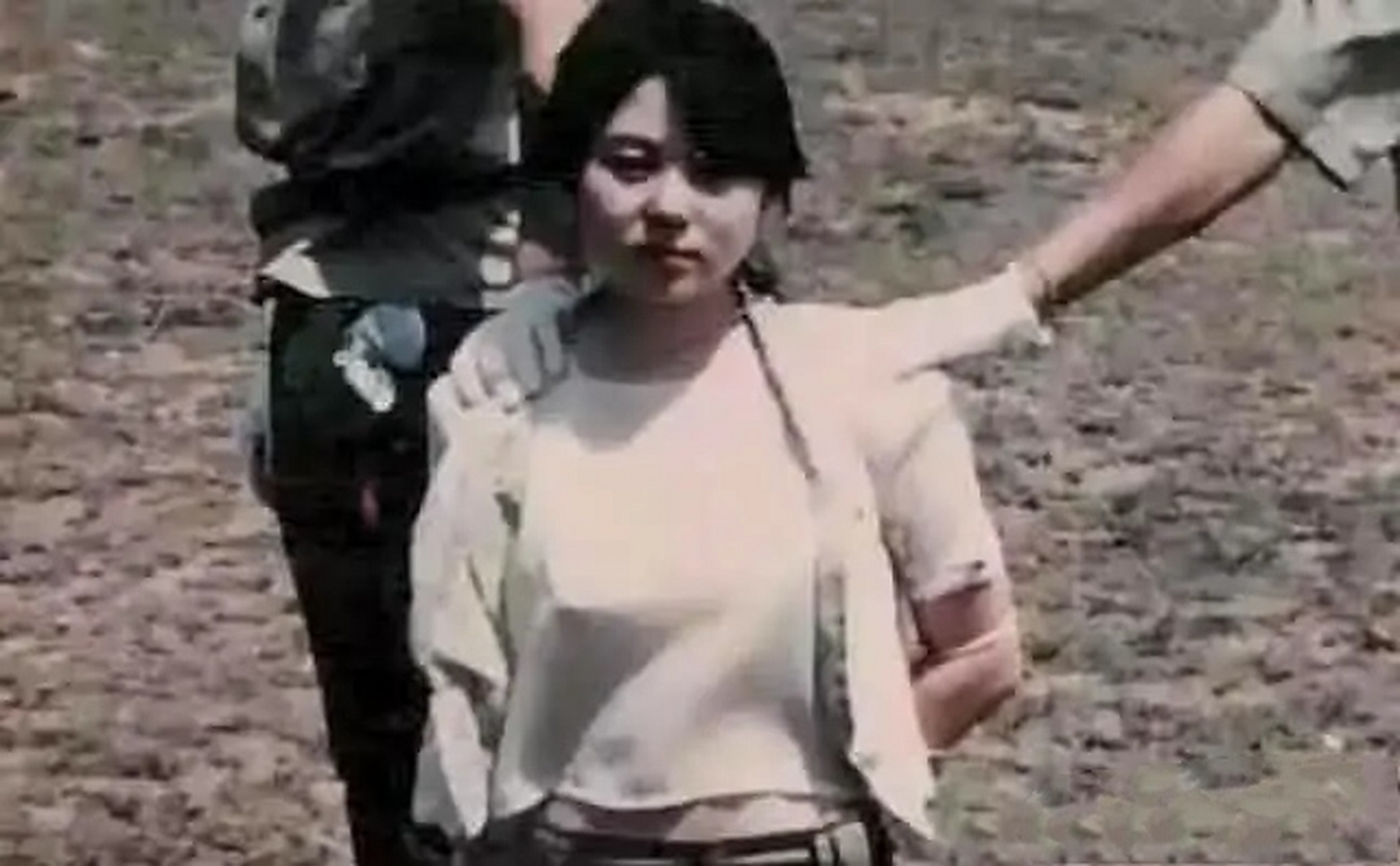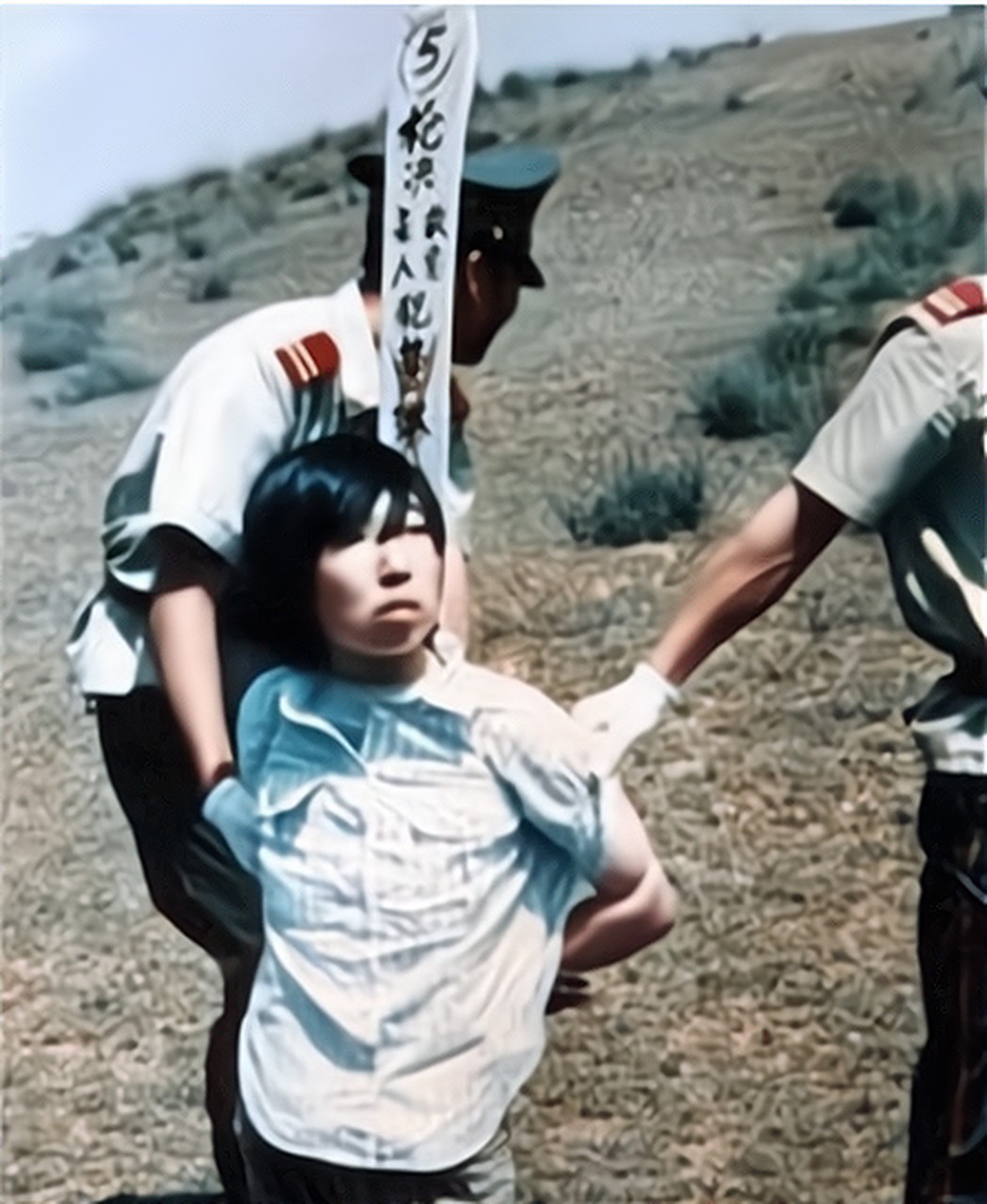她双手被捆绑住,背在背后,而着装却尤为时尚,她穿着美丽的衣服,面带微笑,双膝跪地,后面两个行刑人员将手搭在她的肩膀上。
