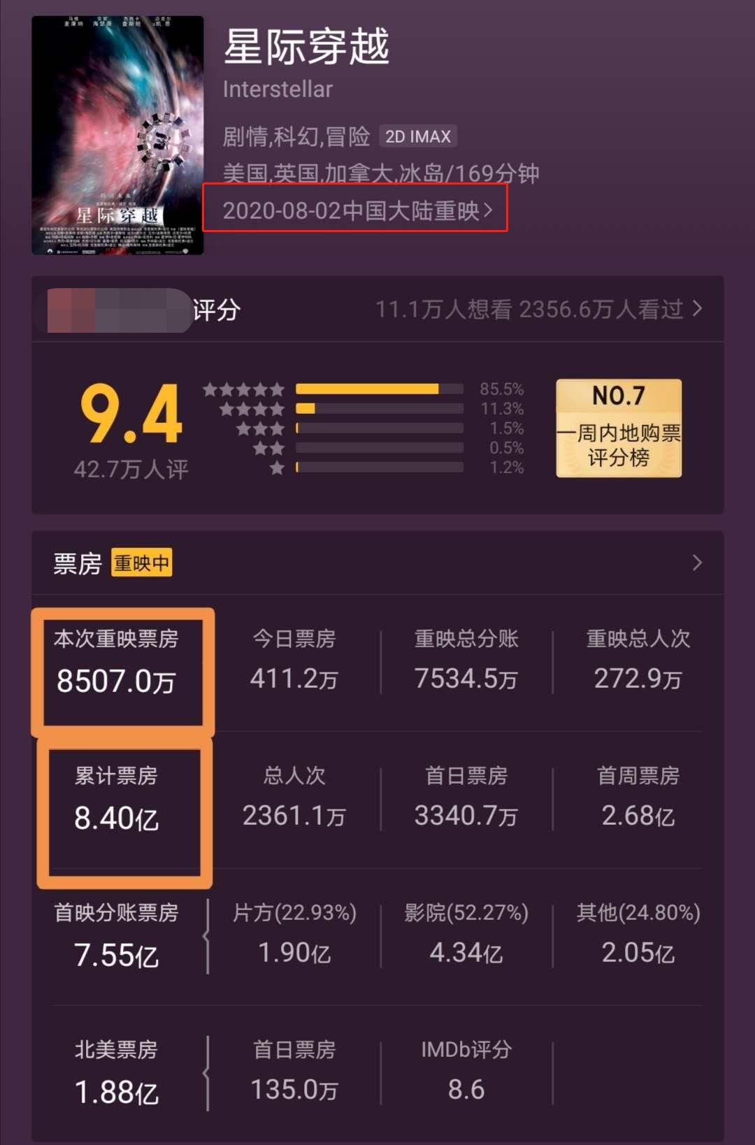 《星际穿越》重映第9天,票房再次夺得8507万,加上首映时7.55亿票房,内地总票房已经来到了8.4亿的高位,后劲走势依旧强悍无比,这次轻松拿到1亿重映票房。