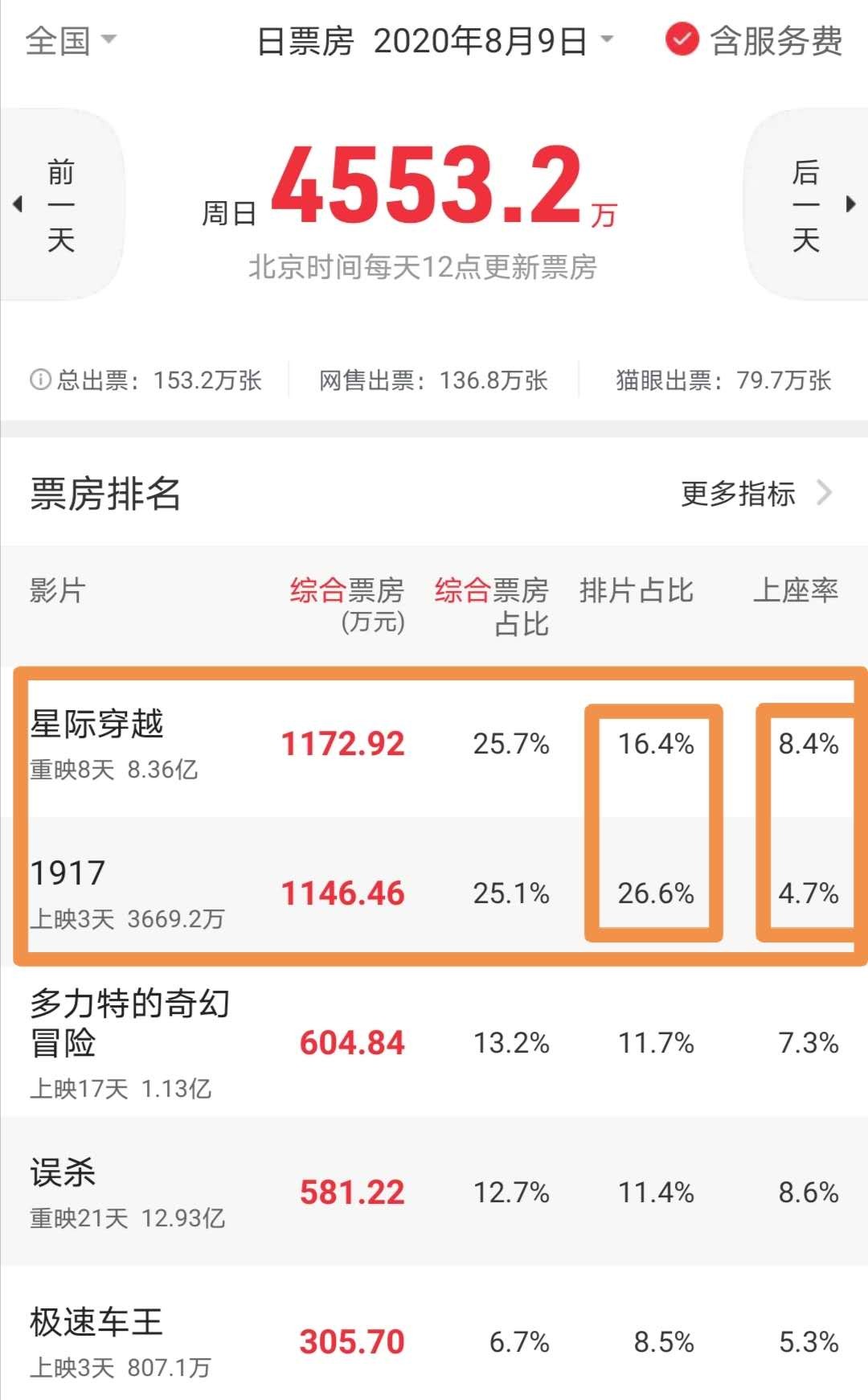 面对奥斯卡拿到三大奖项的战争新片《1917》,《星际穿越》没有丝毫退却,8月9日数据显示:《星际穿越》以低于10个点的排片和高于近4个点的上座率,击败《1917》,单日票房重回巅峰。