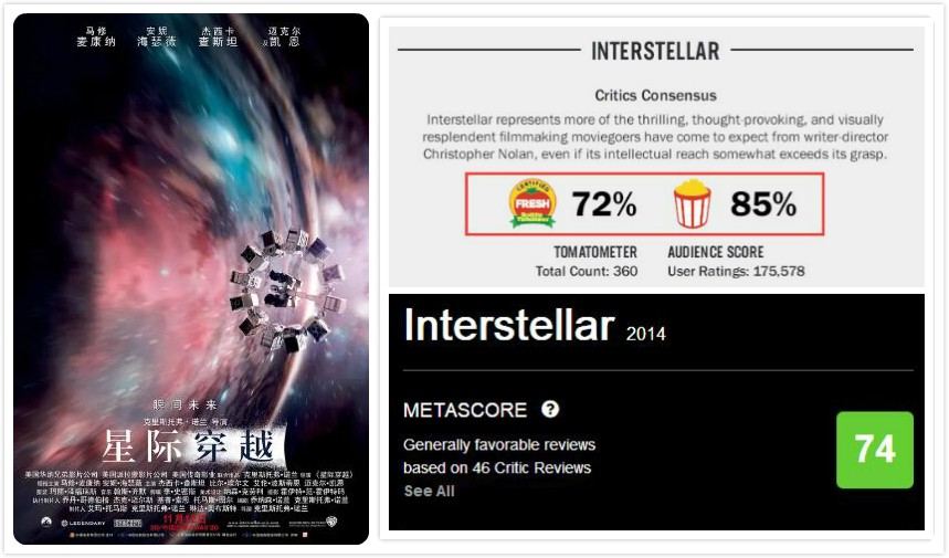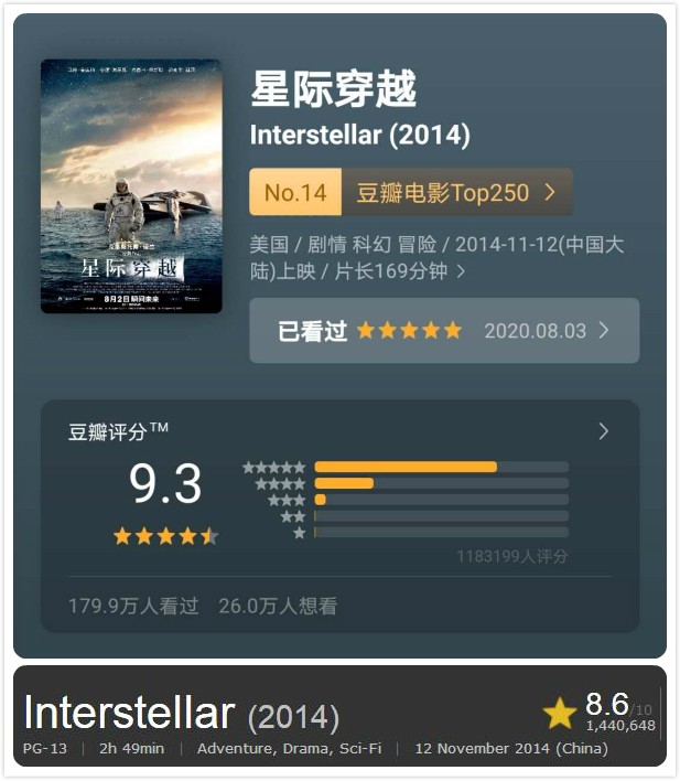 《星际穿越》IMDB评分:8.6,TOP250排第31名,豆瓣评分9.3分,TOP250排第14名;
