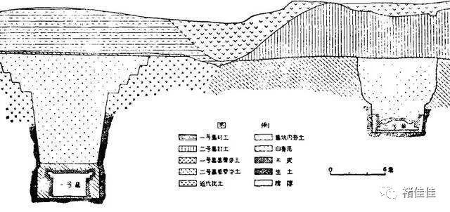 一号墓由封土、墓道、墓坑和墓室(即墓坑下部)四部分构成,形制为长方形土坑竖穴。方向正北。