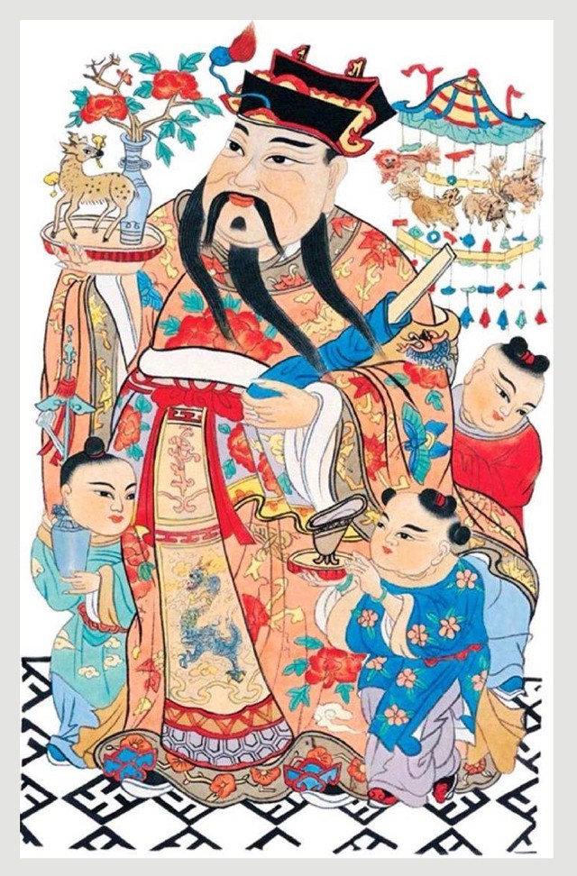 有的三三两两在玩耍嬉戏,有的抱着一条大鲤鱼,又或者吹奏乐器、舞刀弄剑,种种场景,无不生动活泼。最常见的莫过于《万事如意》、《连年有余》、《荷亭消夏》、《五子夺莲》等等,除此之外,还有各种神仙、灶王等等神话题材的年画。
