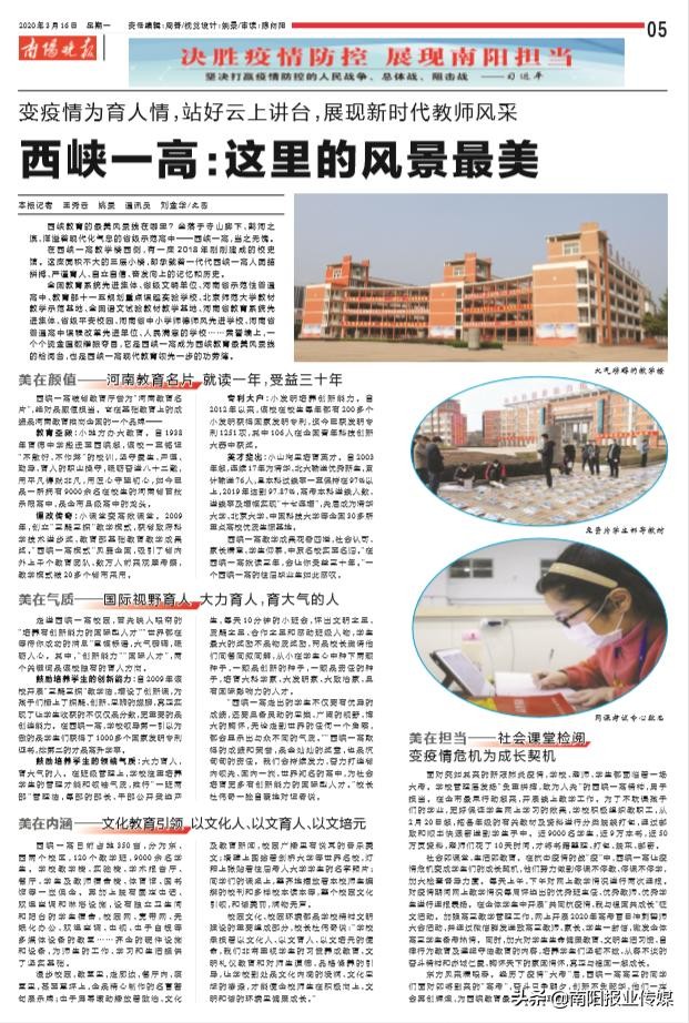 社会即课堂、生活即教育。在抗击疫情的战“疫”中,西峡一高让疫情危机变成学生们的成长契机,他们努力做到停课不停教、停课不停学,加大检查督导力度。每天上午、下午对网上教学情况进行两次通报。对疫情期间网上教学情况每周评选出的优秀班主任、优秀教师、优秀学生进行通报表扬。在全体学生中开展“共同抗疫情、我与祖国共成长”征文活动。加强高三教学管理工作,网上开展2020年高考百日冲刺誓师大会活动,并通过微信群发送致高三教师、家长、学生一封信,激发全体高三学生备考热情。同时,加大对学生生命健康教育、文明生活习惯、自律行为教育及遵纪守法教育的内容,培养学生们坚韧不拔、从容不迫的奋斗精神和赤诚仁爱、胸怀天下的家国情怀,真正与祖国一起成长。