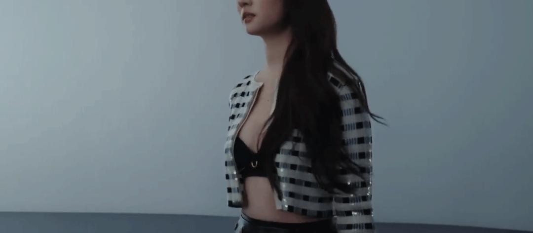 视频中,她身穿黑皮裙配短上衣,内搭一件运动文胸。