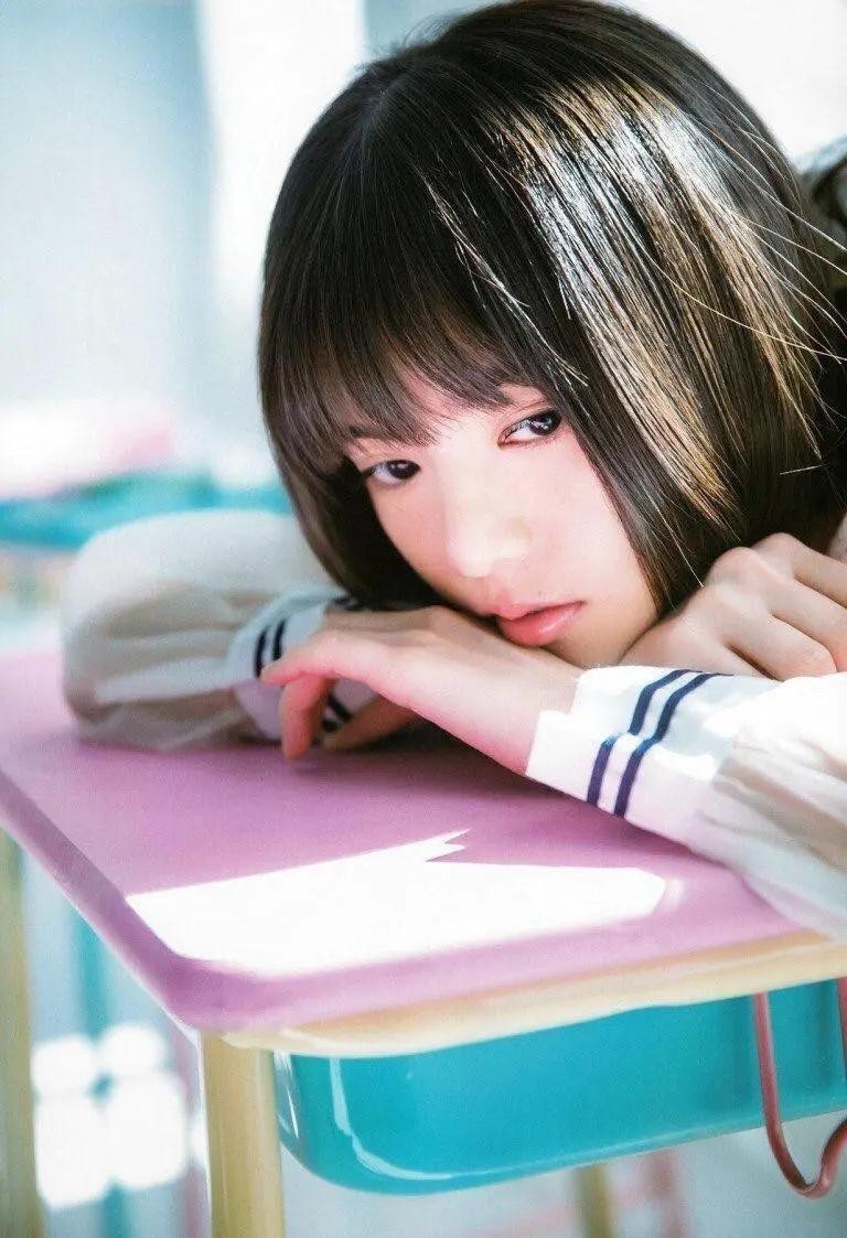这张照片的表情梦幻又成熟,很有校园美少女的气质。