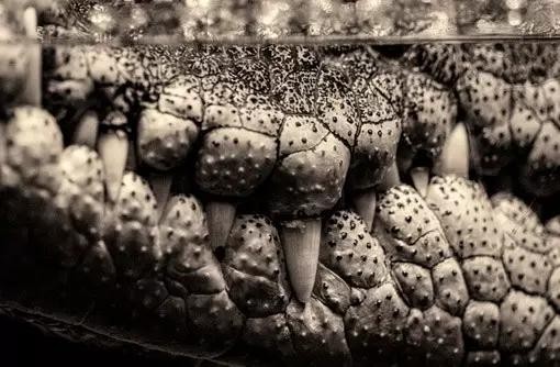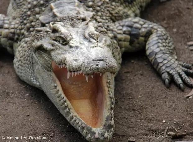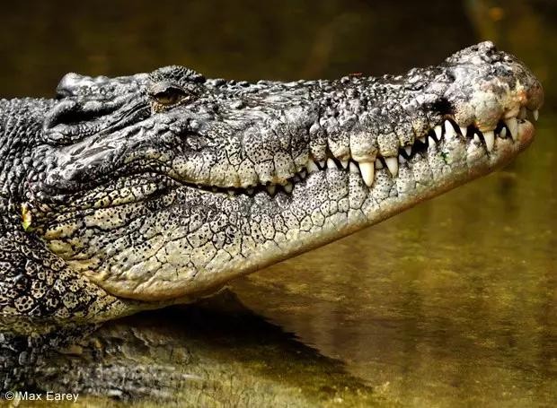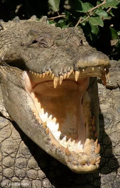 湾鳄是鳄目中唯一颈背没有大鳞片的鳄鱼,亦被称为“裸颈鳄”。上颌每侧具齿16-19枚,下颌每侧14-15枚。