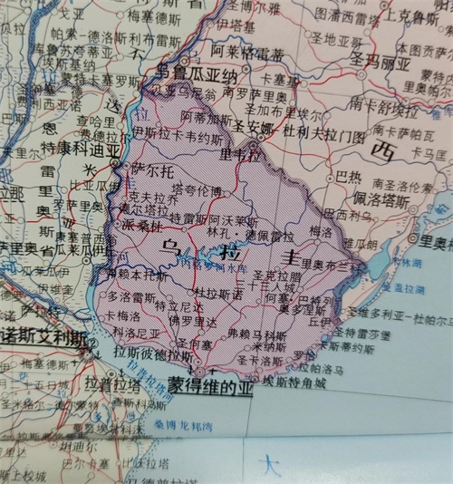 【地理】 位于南美洲东南部,乌拉圭河与拉普拉塔河的东岸。北邻巴西,西界阿根廷,东南濒大西洋。海岸线长660公里。地势平坦,丘陵和草原相间,平均海拔116.7米。属温带气候,1~3月为夏季,气温17℃~28℃,7~9月为冬季,气温6℃~14℃。年降水量由南至北从950毫米递增到1250毫米。